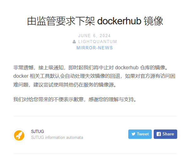 2024-06-06-上交大镜像站发布公告下架 Docker Hub 镜像站